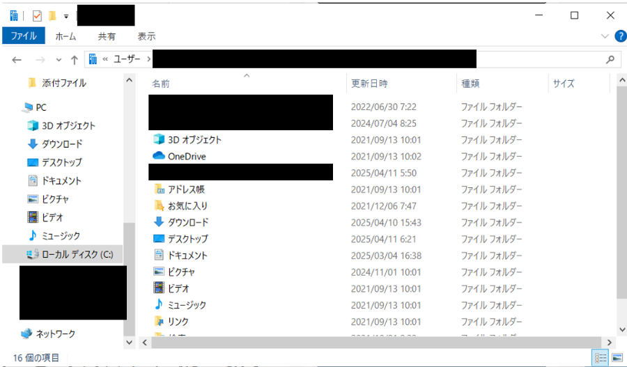 まず、エクスプローラを開いてユーザーのフォルダを開きます。