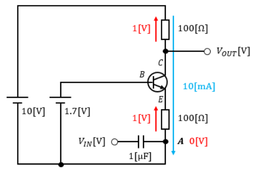 つまり、エミッタ端子側の100Ω抵抗には1.0[V]の電圧がかかるので、オームの法則よりエミッタ電流IEは10[mA]になることがわかります。