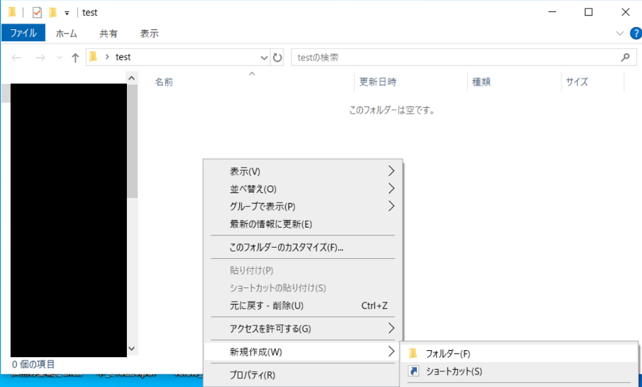 まず、デスクトップ上に「test」というフォルダを用意し、testフォルダ内で右クリックして「新規作成」から「フォルダ」を選択しました。