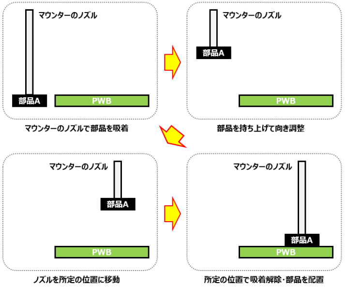 ノズルで部品を吸着して、カメラで吸着向きを認識・調整し、指定の箇所に置くという動作を高速で繰り返すのです。