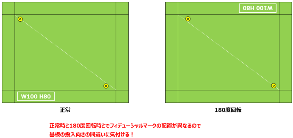 ということは、ヒューマンエラーで本来の基板流し方向とは180度回転させた状態でマウンターに基板を投入してしまったとしても、フィデューシャルマークの位置は正常に読み取れているので正常に投入されたものと判断してしまうのです