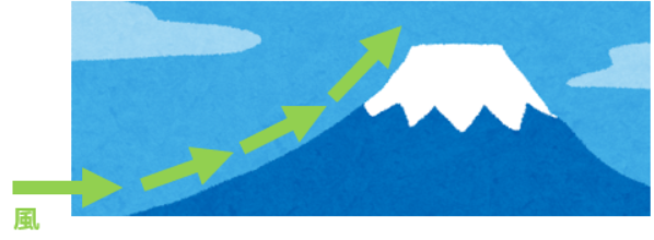 例えば、山に向かって風が吹いたとすると、山の斜面に沿ってどんどん上の方に風が昇っていくことになりますよね?