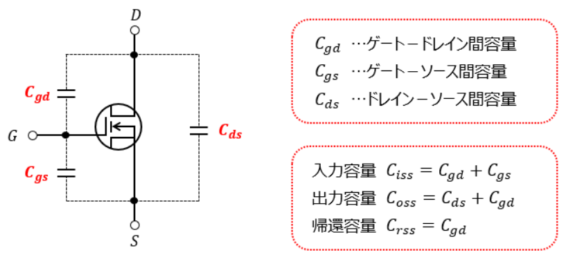 具体的には、入力容量・出力容量・帰還容量という3種類の寄生容量がスイッチング特性に影響します。