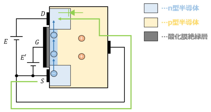 反転層を形成してドレイン-ソース間に電流を流れるようにした接続は以下のようになります。