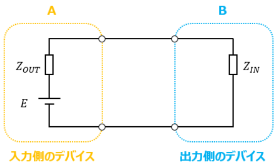 逆に、入力側のデバイスから見た時の出力側のインピーダンスのことを出力インピーダンスと呼びます。