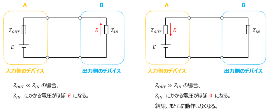 その場合、出力インピーダンスZOUTでの電圧降下を最低限に抑え、電源電圧Eをほぼ入力インピーダンスZINに印加できるようにするのが望ましいです。