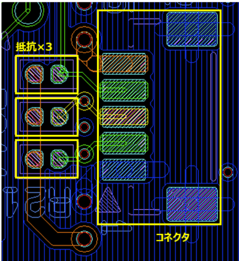 この図の場合、部品を配置するためのパッドが以下の黄色丸部になります。