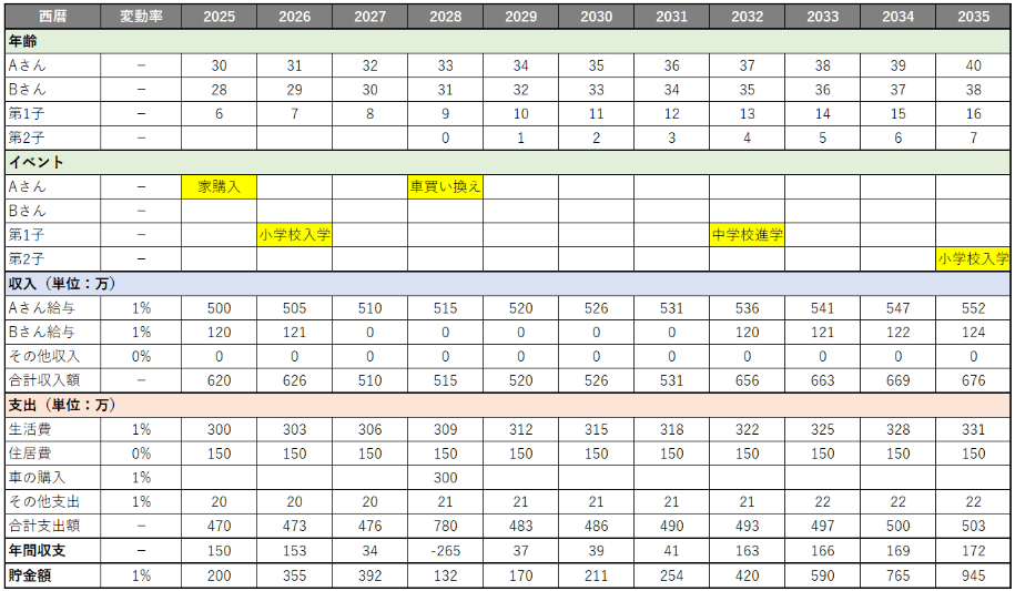 この表は説明のために年数を短く、またライフイベントを少なくして簡易化しています。