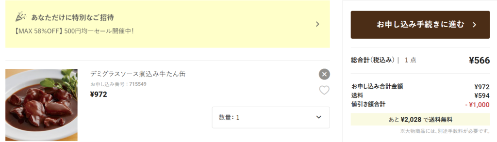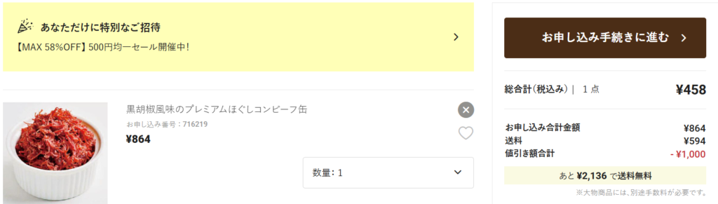 ということで問題は無いかと思いきや、税込3,000円以上から送料無料で条件を満たさないと594円送料がかかるという落とし穴があります。