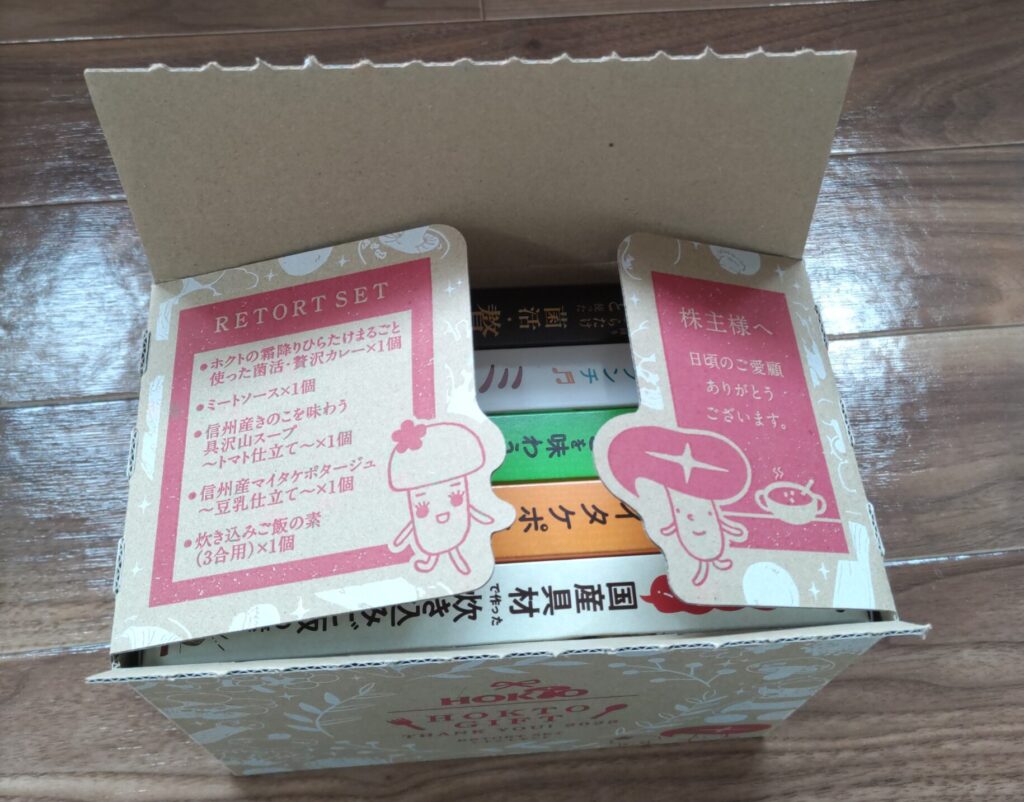 ホクトの優待は、自社グループ製品詰め合わせセットです。