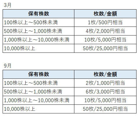 なんか1,000株以下の保有の場合、微妙に3月と9月で貰える枚数に差があるんですよね。