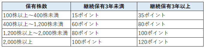 ポイントは、保有株数と継続保有年数によって以下のように変化します。