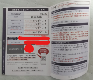 権利確定月は12月なので、3月頃になると優待ポイントとログインコードの案内はがきが届きます。