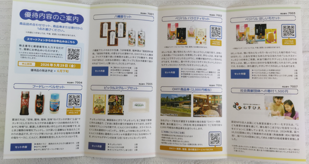 自社グループ商品詰め合わせの他に、自社グループ会社施設商品券や寄付を選べたり、保有株数によってはQUOカードに変化したりします。