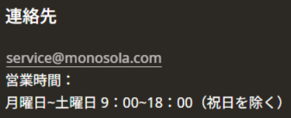 そして、会社概要に載ってるメールアドレス(service@mail.monosola.com)と連絡先のメールアドレス(service@monosola.com)が異なっています。