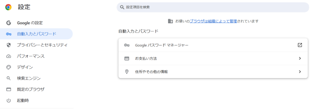 これでGoogle Chromeの設定画面が開きますので、[自動入力とパスワード]から[Googleパスワードマネージャー]を開きます。