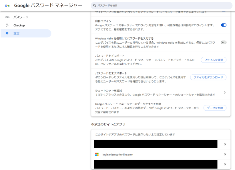 [Googleパスワードマネージャー]の[設定]を選択して下にスクロールすると、[不承認のサイトとアプリ]という項目があります。