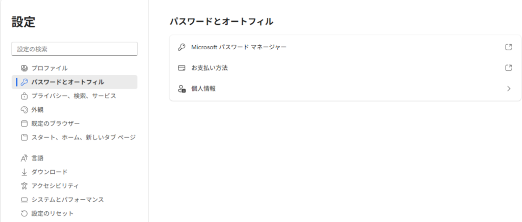 これでMicrosoft Edgeの設定画面が開きますので、[パスワードとオートフィル]から[Microsoft パスワードマネージャー]を開きます。